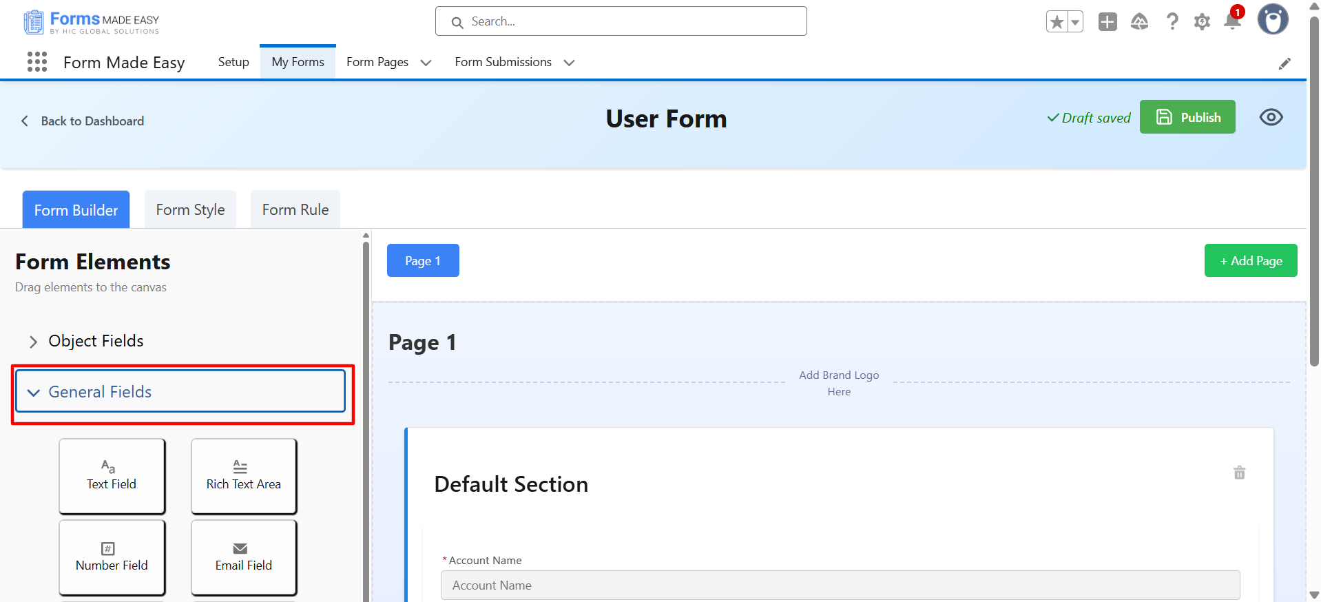 General Fields: It allows you to drag & drop the General Fields, such as Text, Text area, Email, Number, Signature, etc.