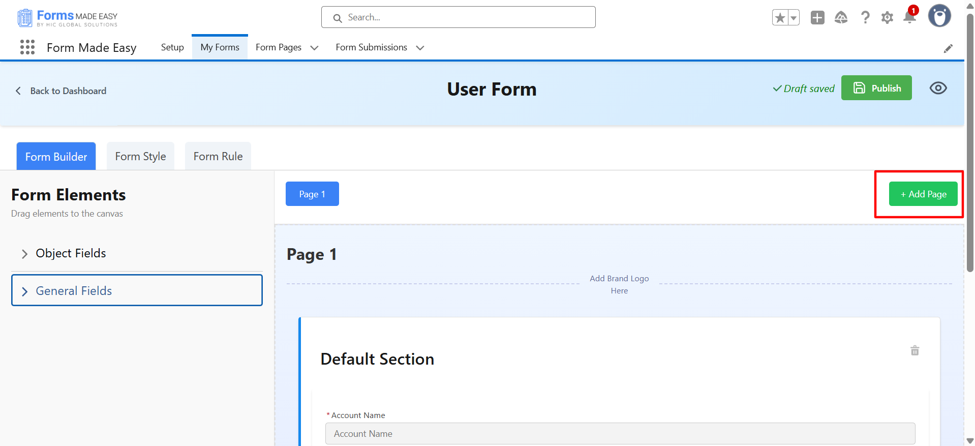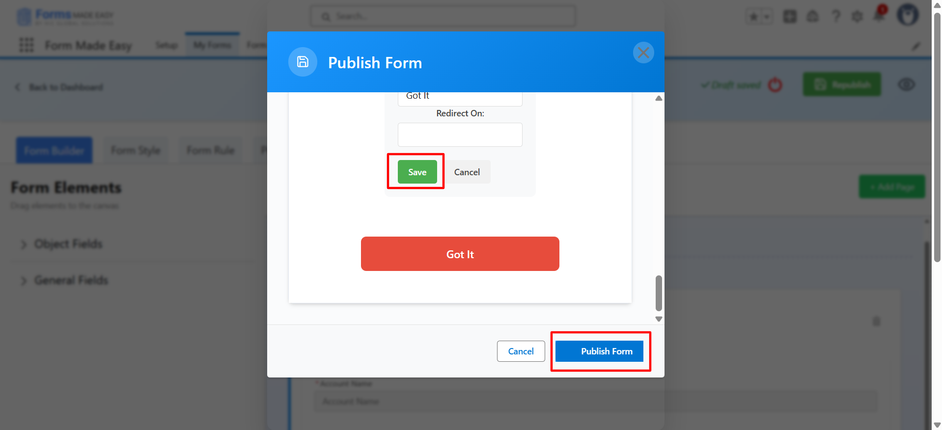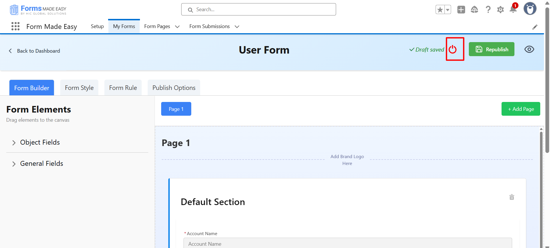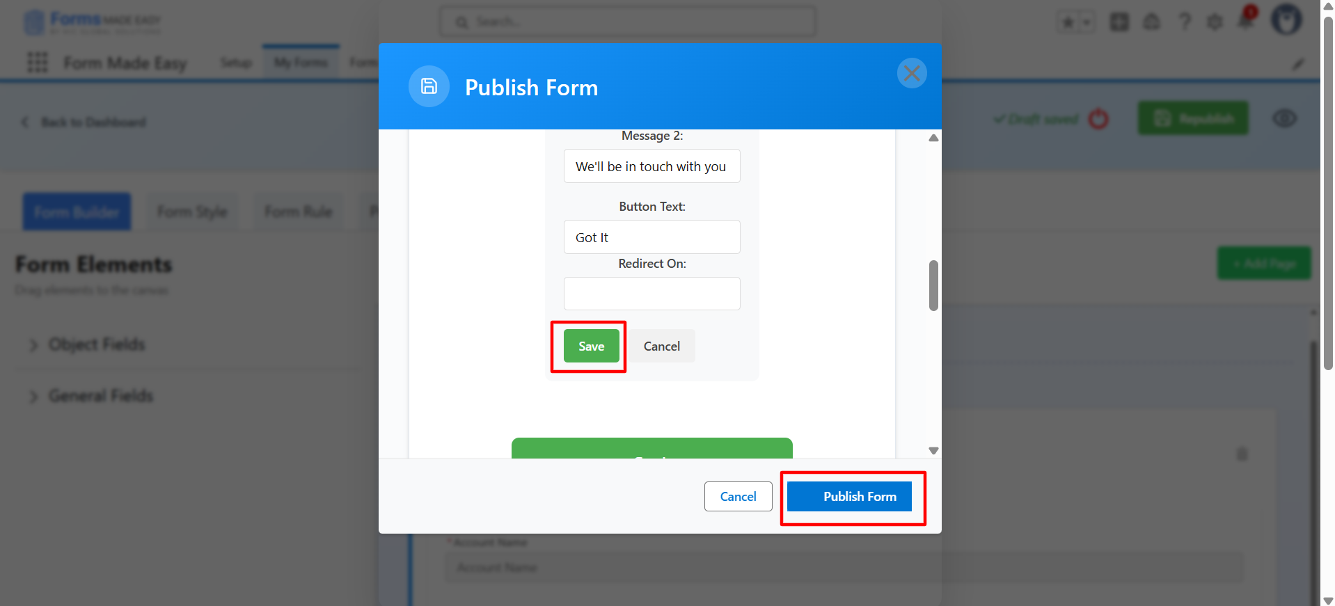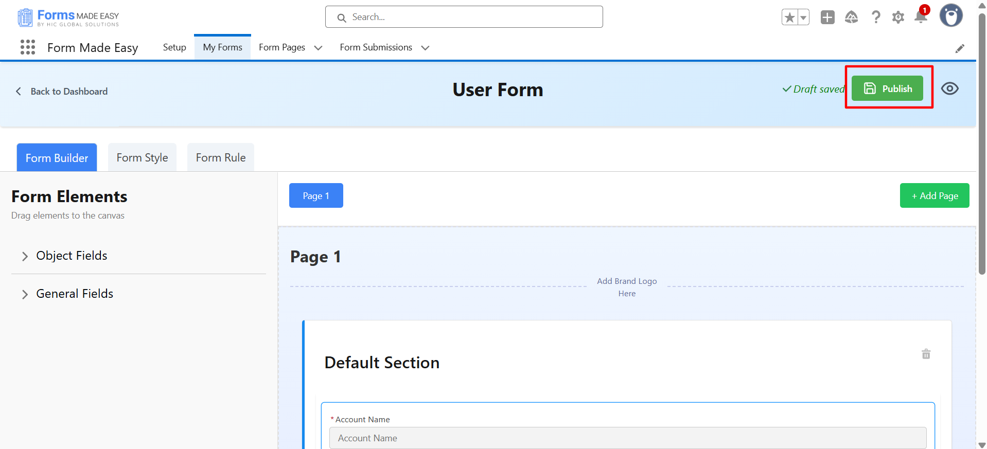 Note: Until you publish the form, this functionality will not be displayed to the user.