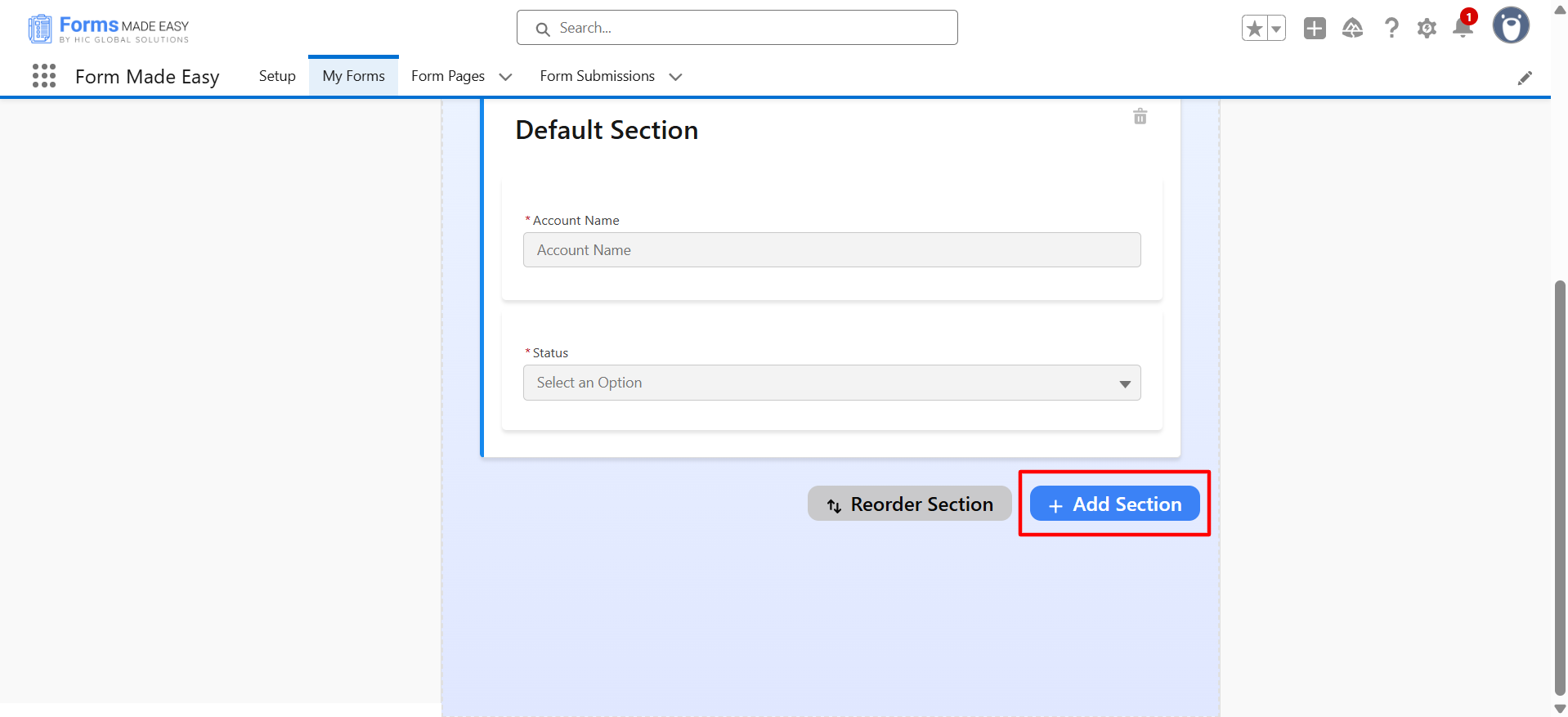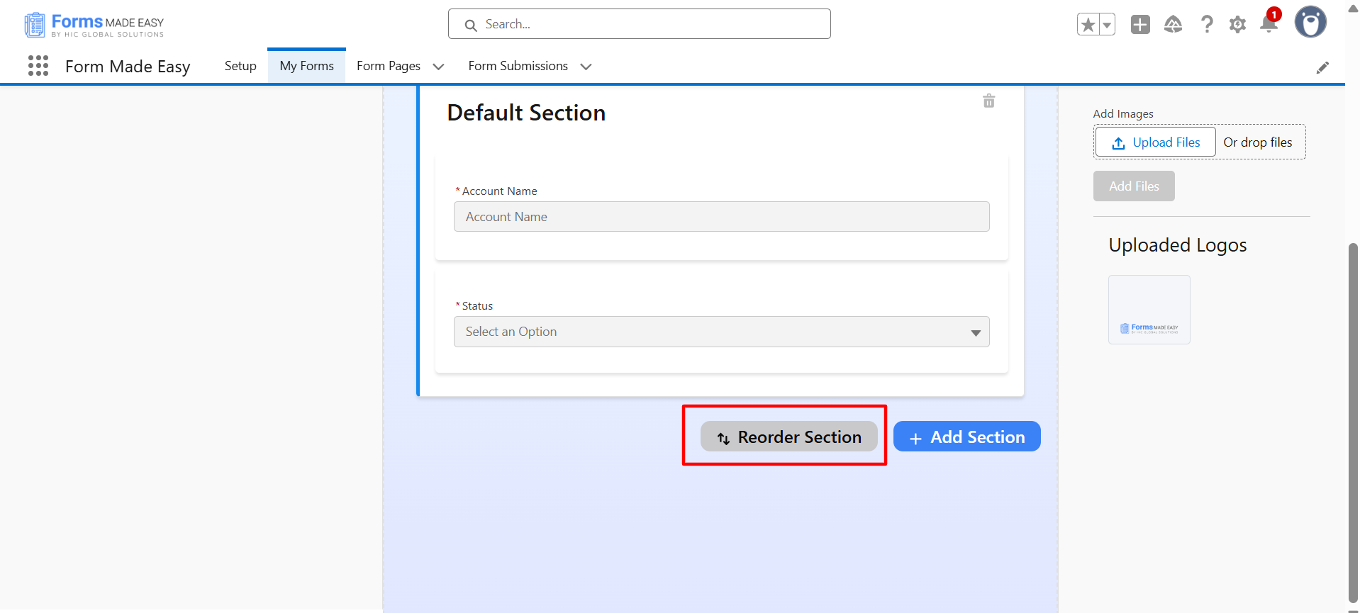 Reorder Section: With this option, you can reorder the sections of the same form.