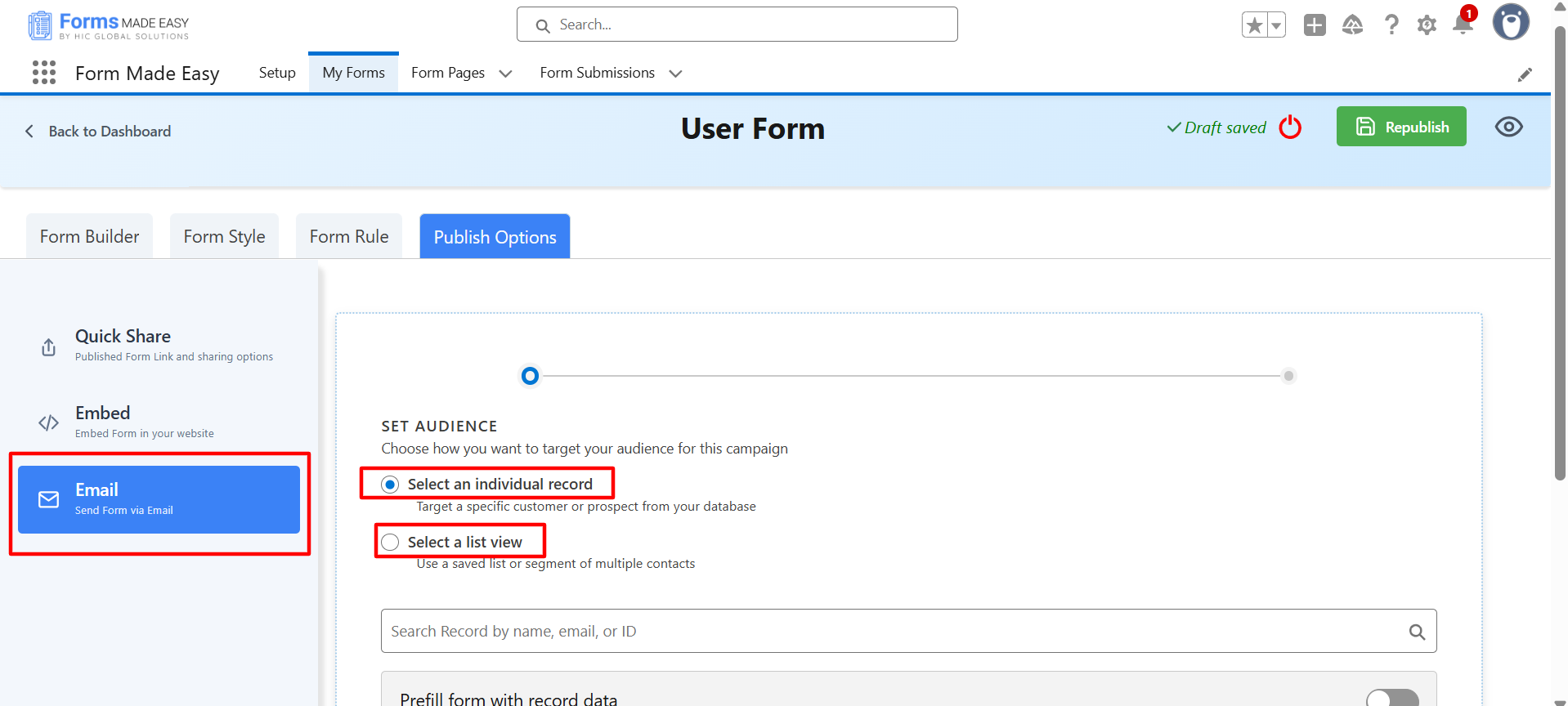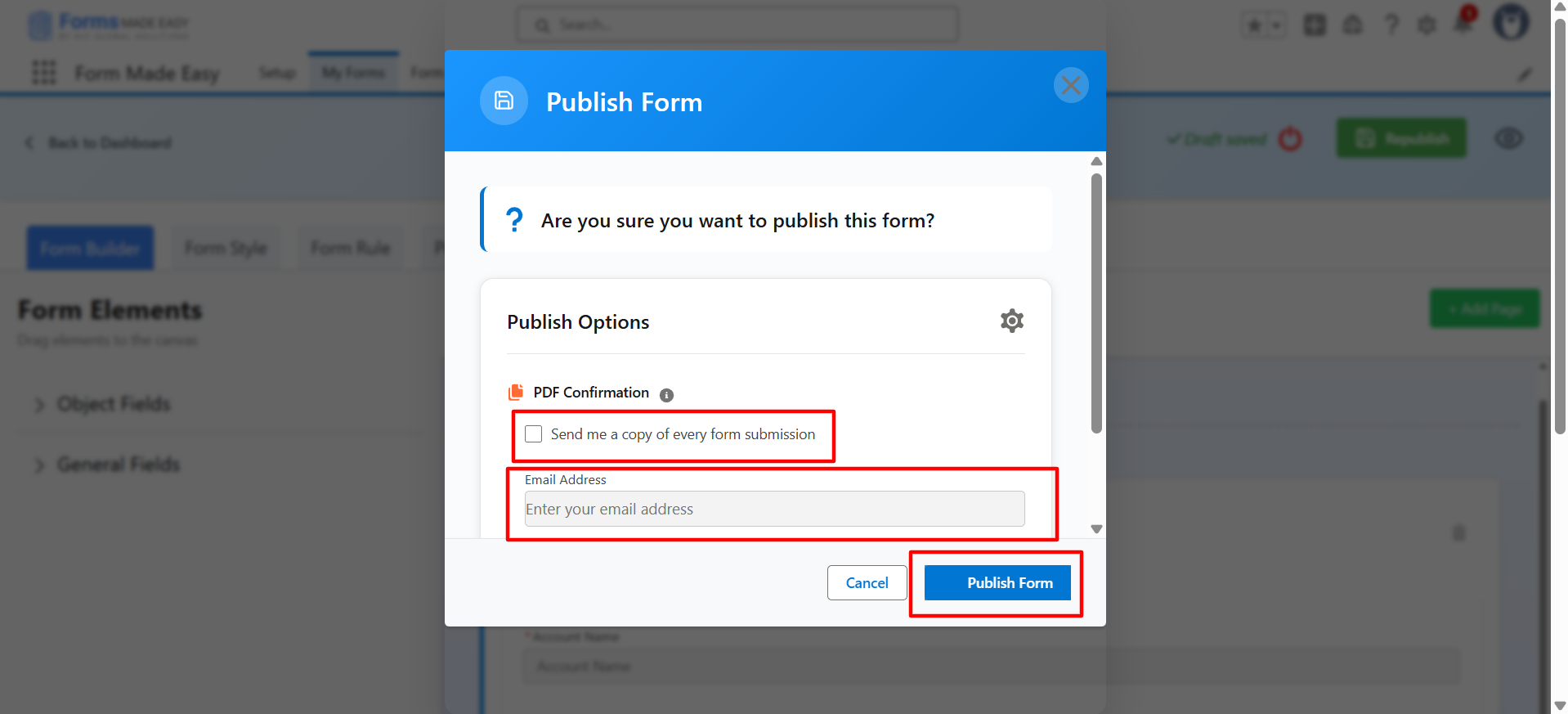Publish Form: You can publish the form after that form is publicly available. First, tick the checkbox and then add the email address to get every submission of the form.