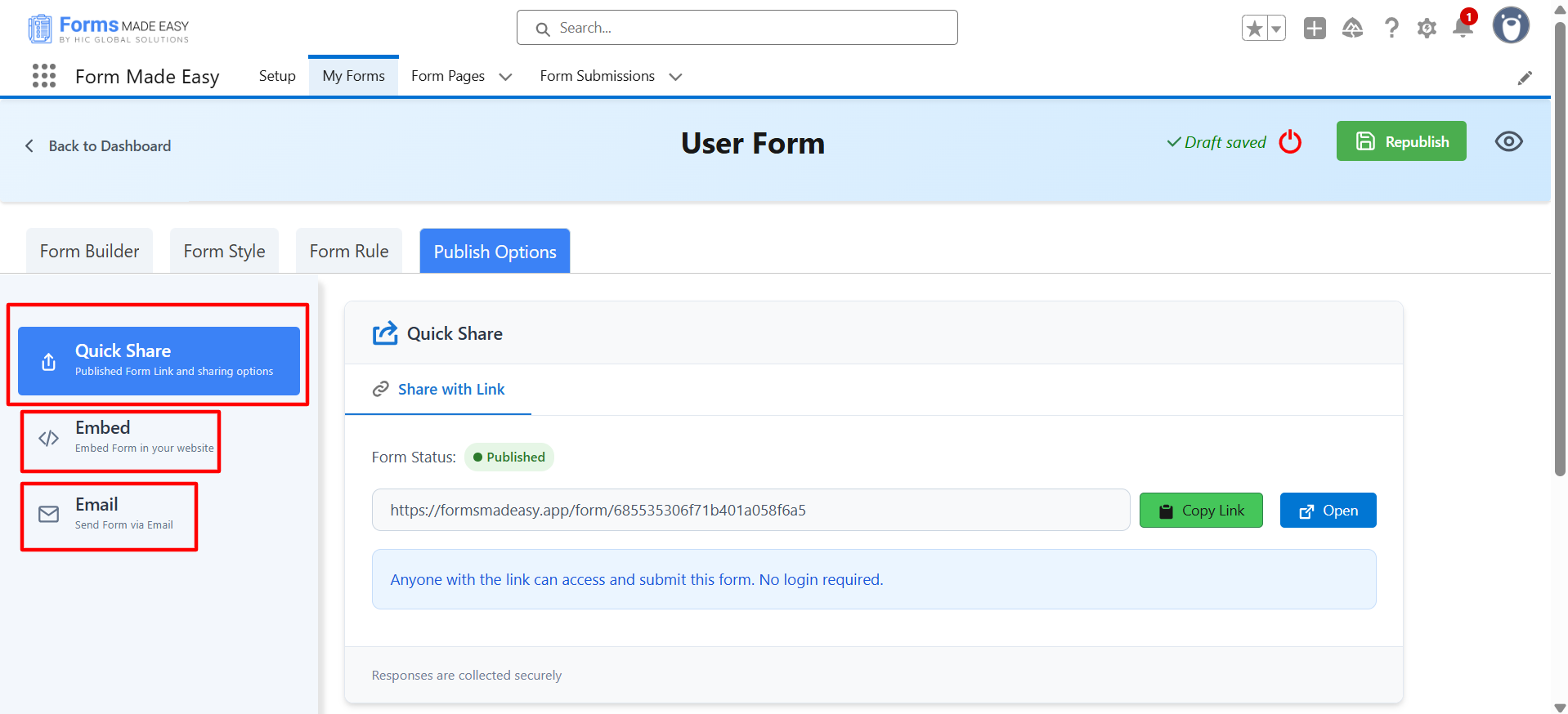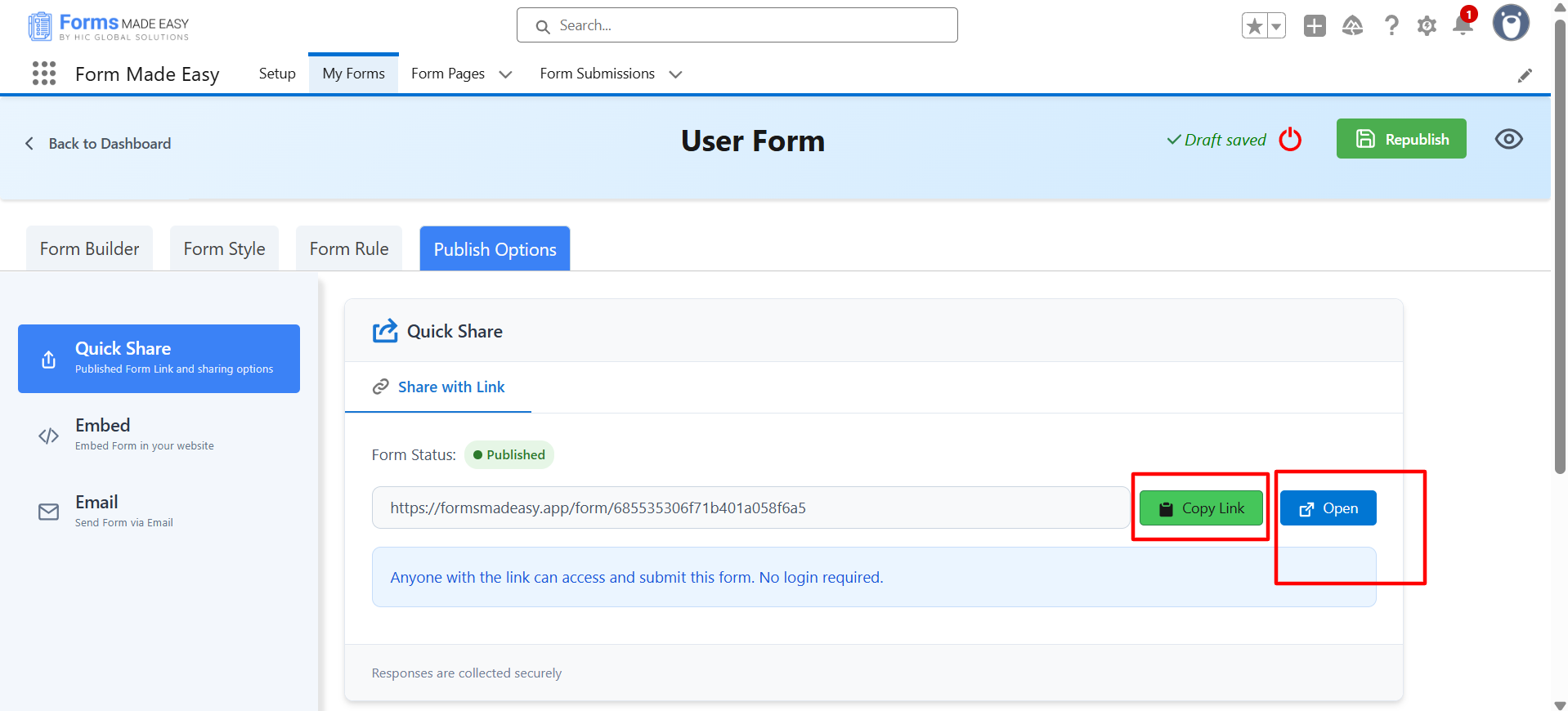 Share with link: Users can share the public URL of the form. Copy the URL or directly open the form.