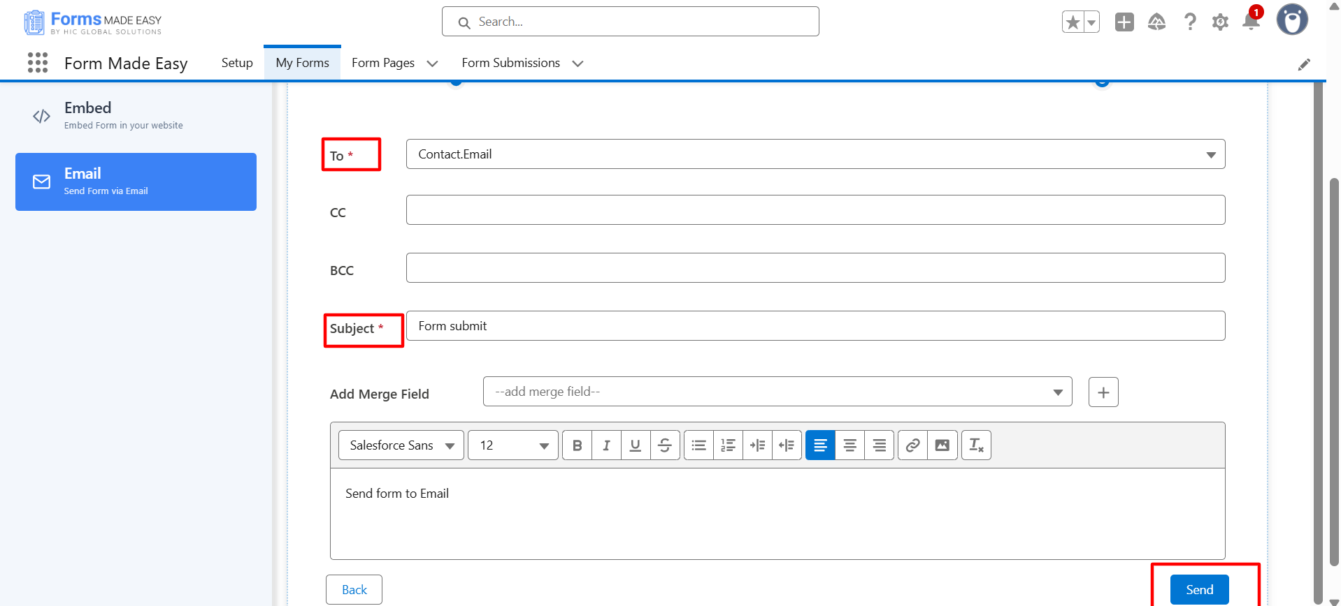 c. Email: The email will work only if the object that has been selected has an email field that you can drag and drop into the form.
