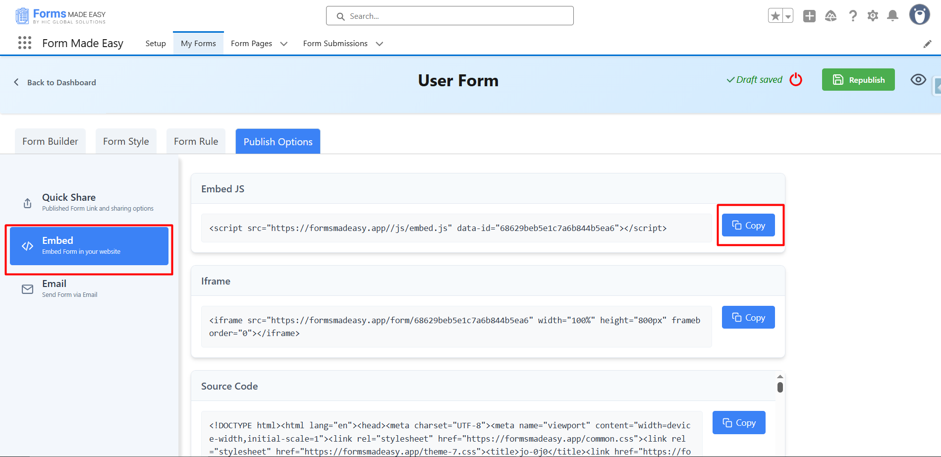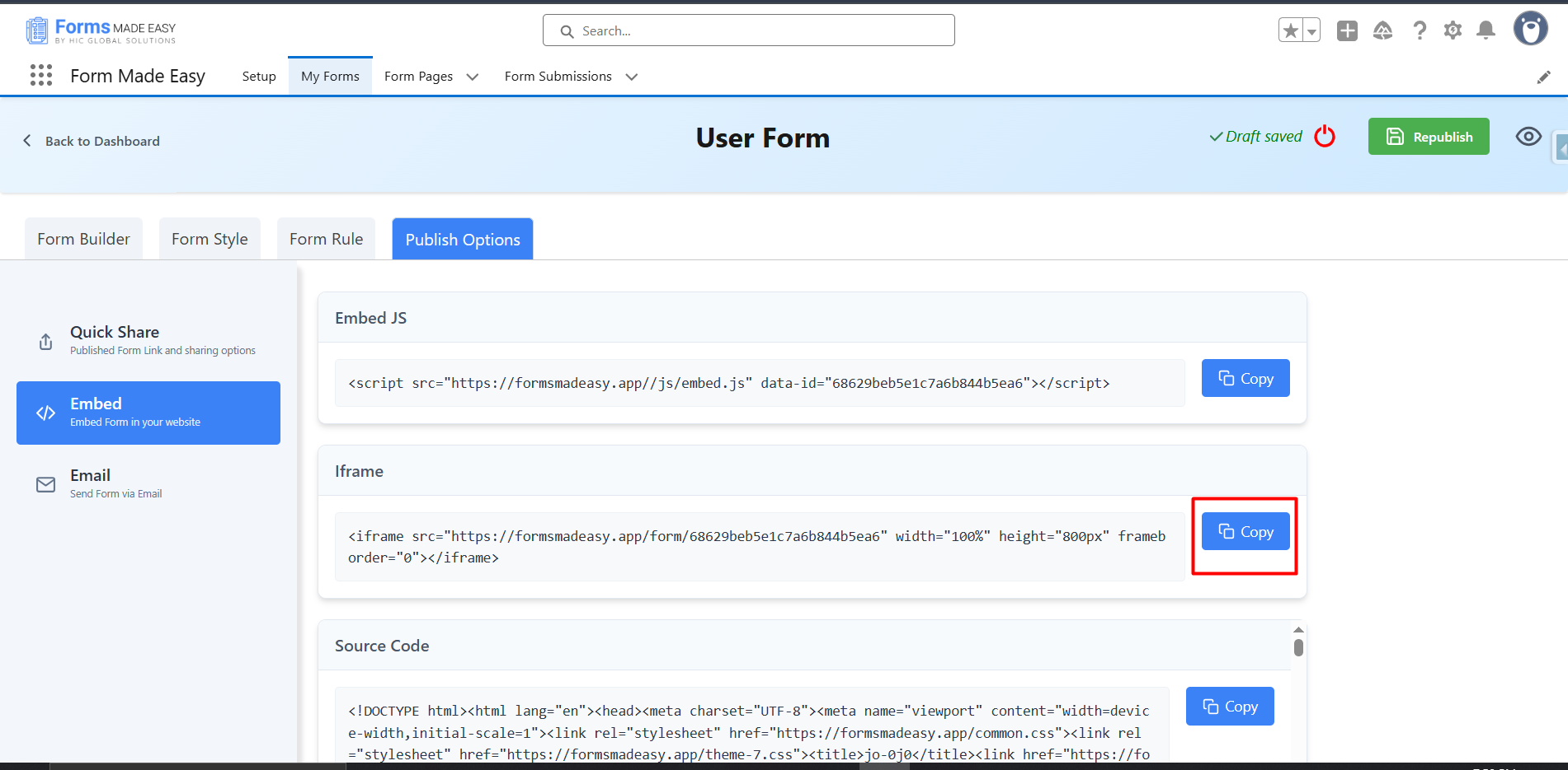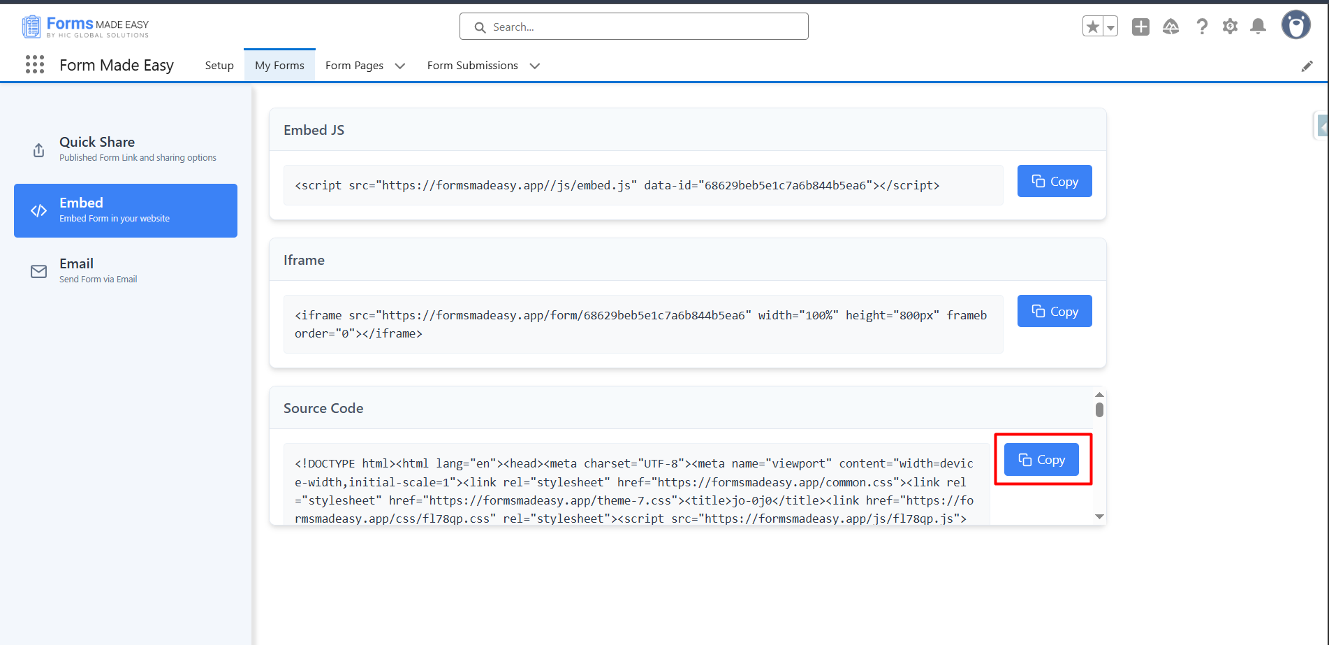 Source Code: Here, you can copy the code directly and access the source code of your form.
