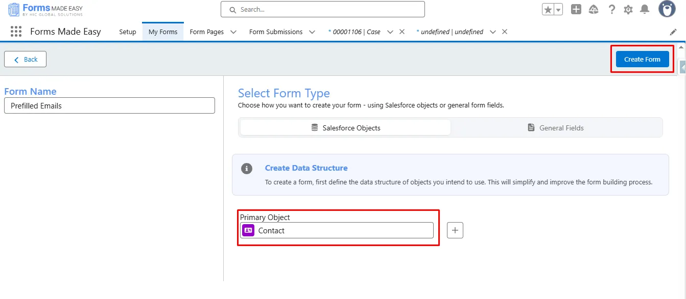 • Step 3: Select "Contact" as the Primary Object and click the "Create Form" button.