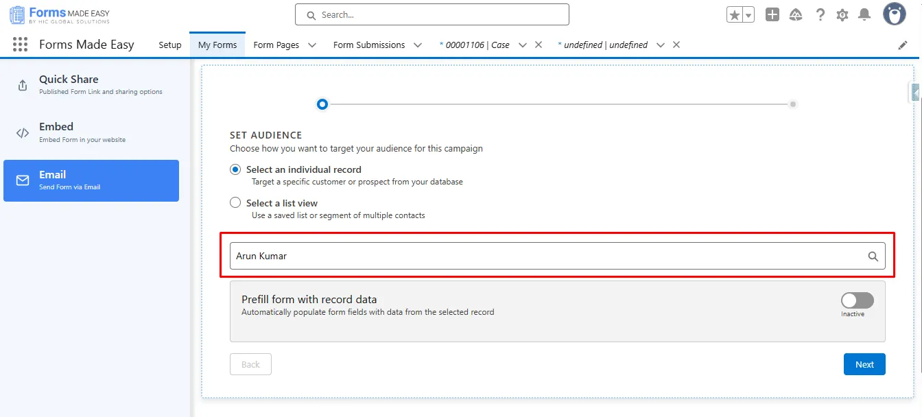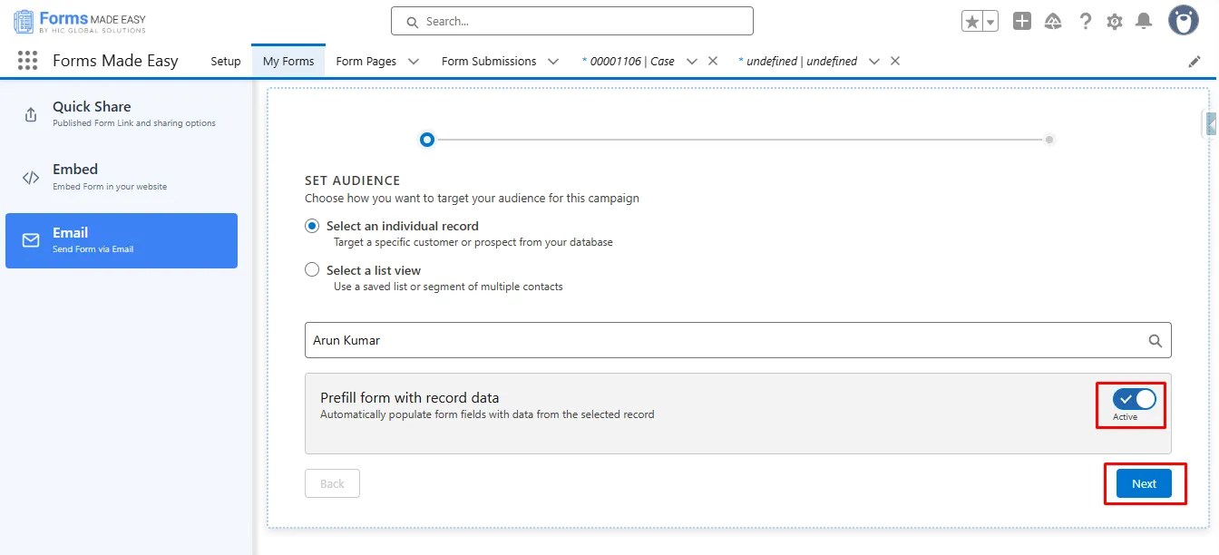 • Step 12: For prefill form click on the toggle "Prefill form with record data" and click "Next."