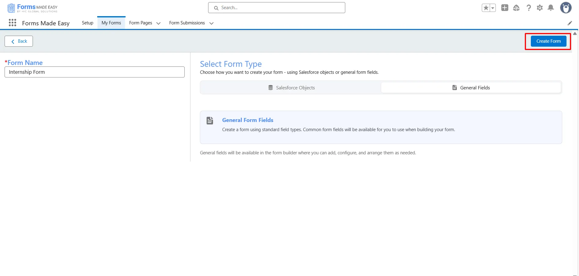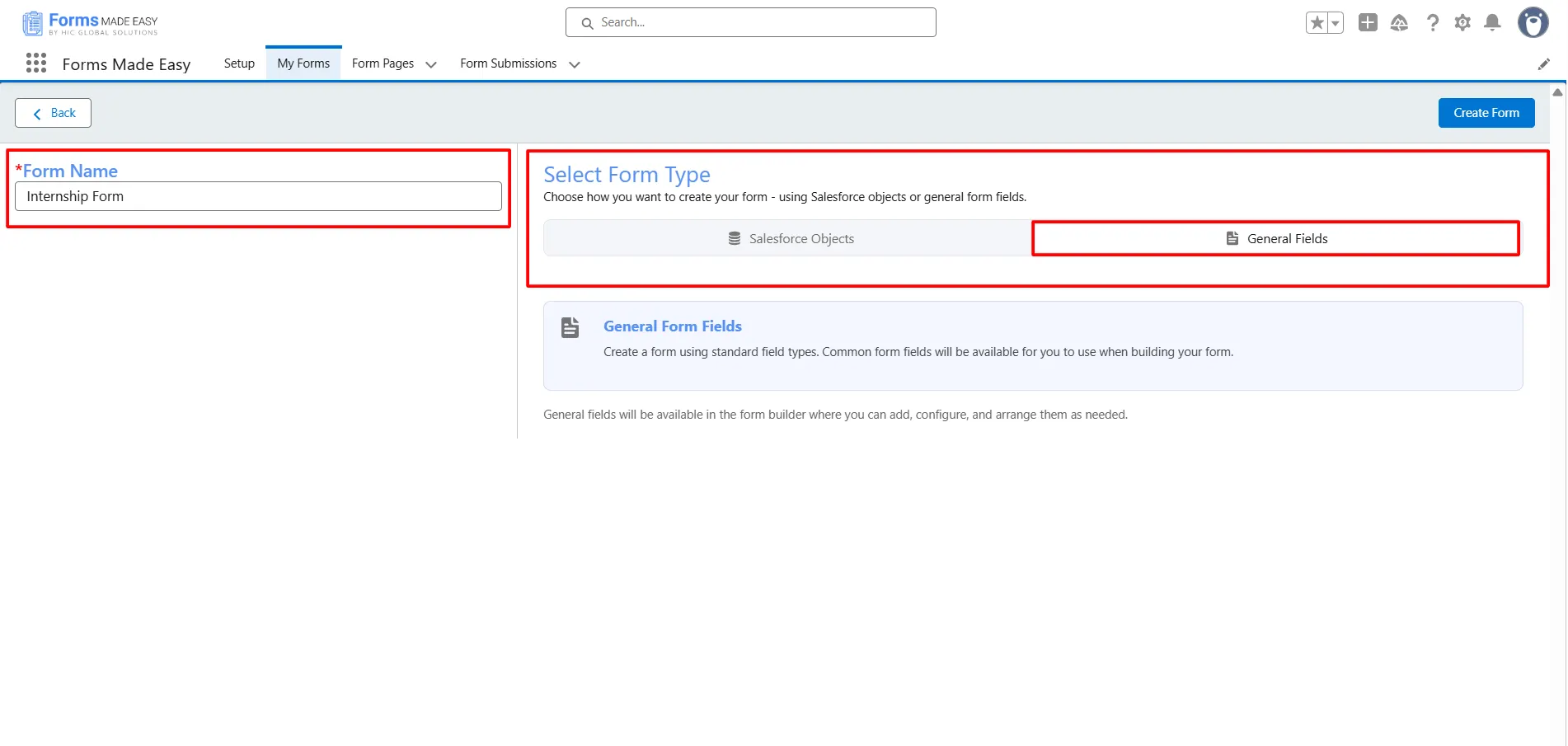 - Step 2: Enter the form name and select the form type (Salesforce Objects or General Fields).