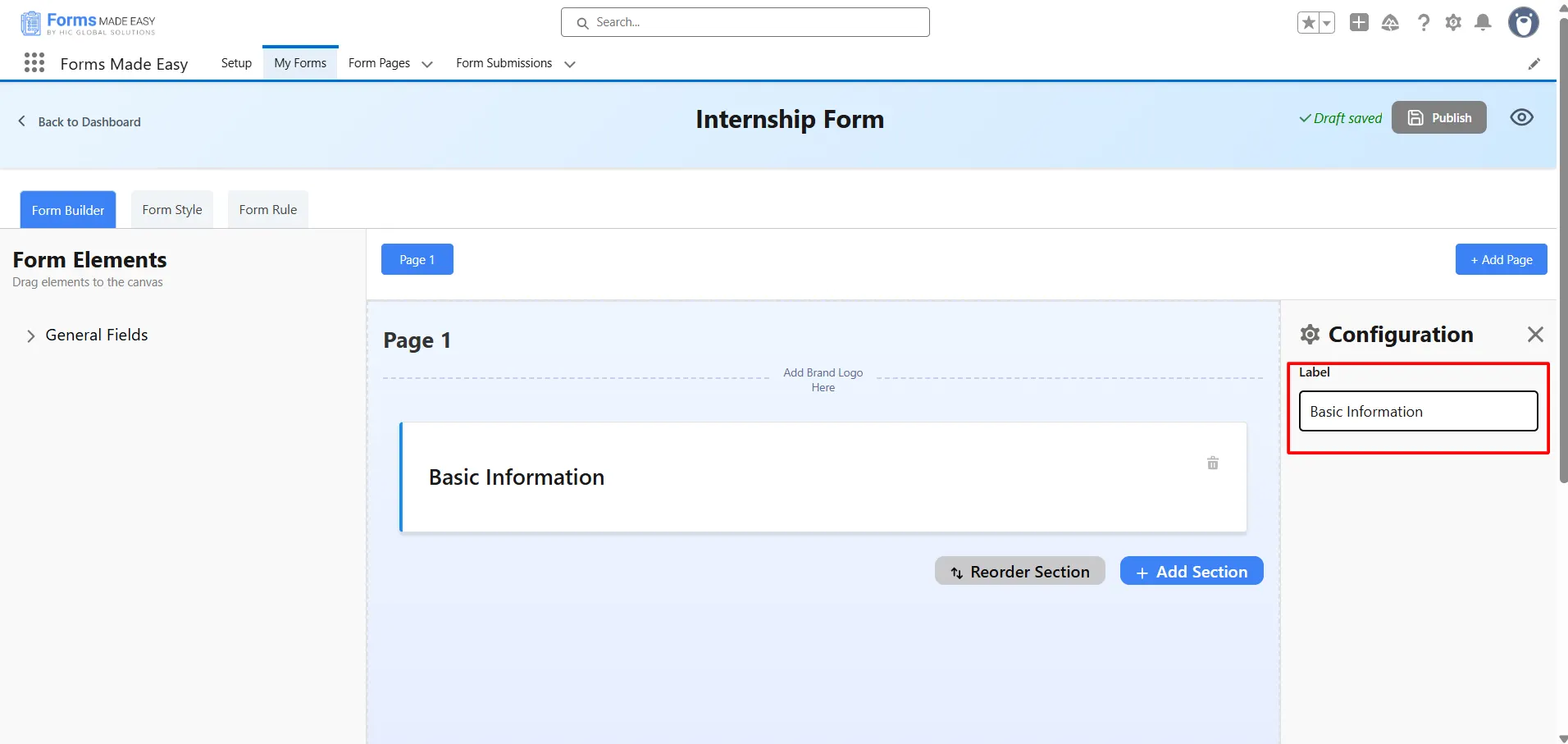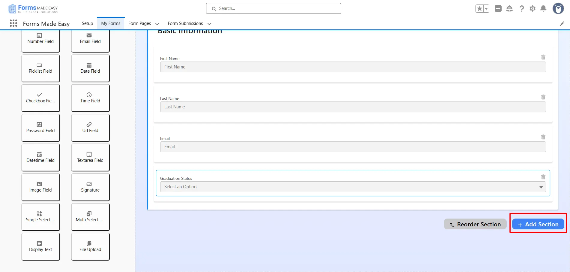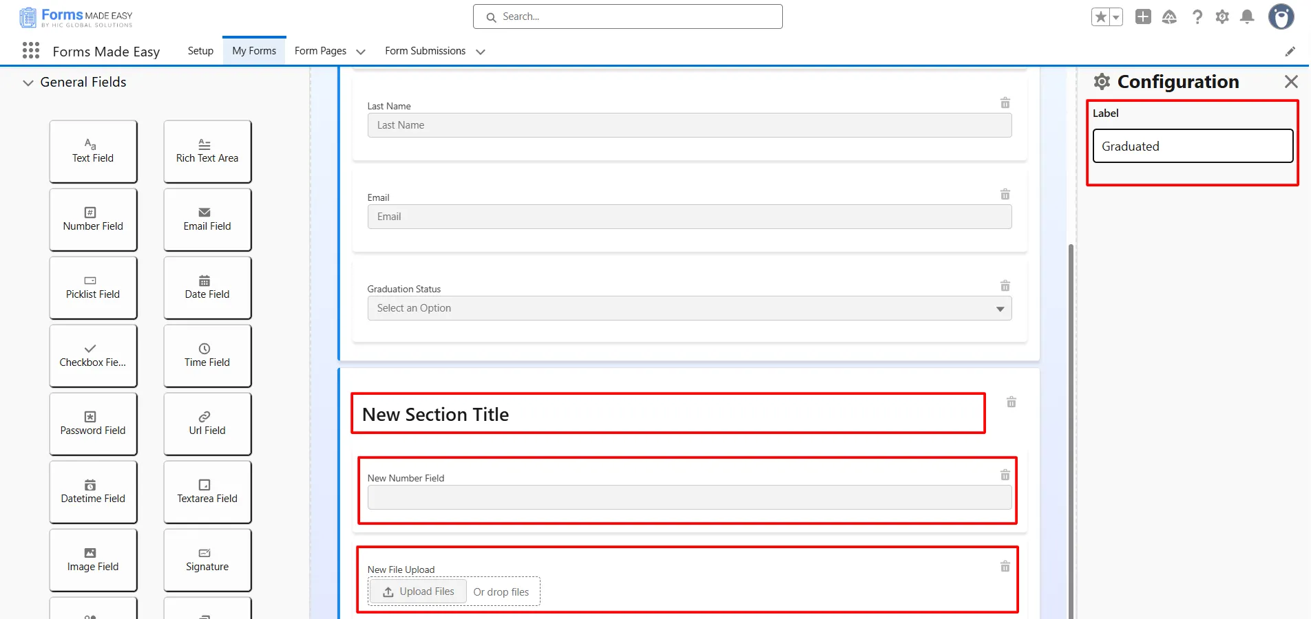 - Step 9: Click on the New Section Title and enter a name for the section as per your requirements. After that, drag and drop your required fields into this section to include them in your form.