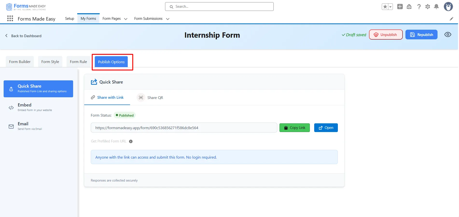 - Step 18: Once the form is published, an additional Publish Options tab becomes available.