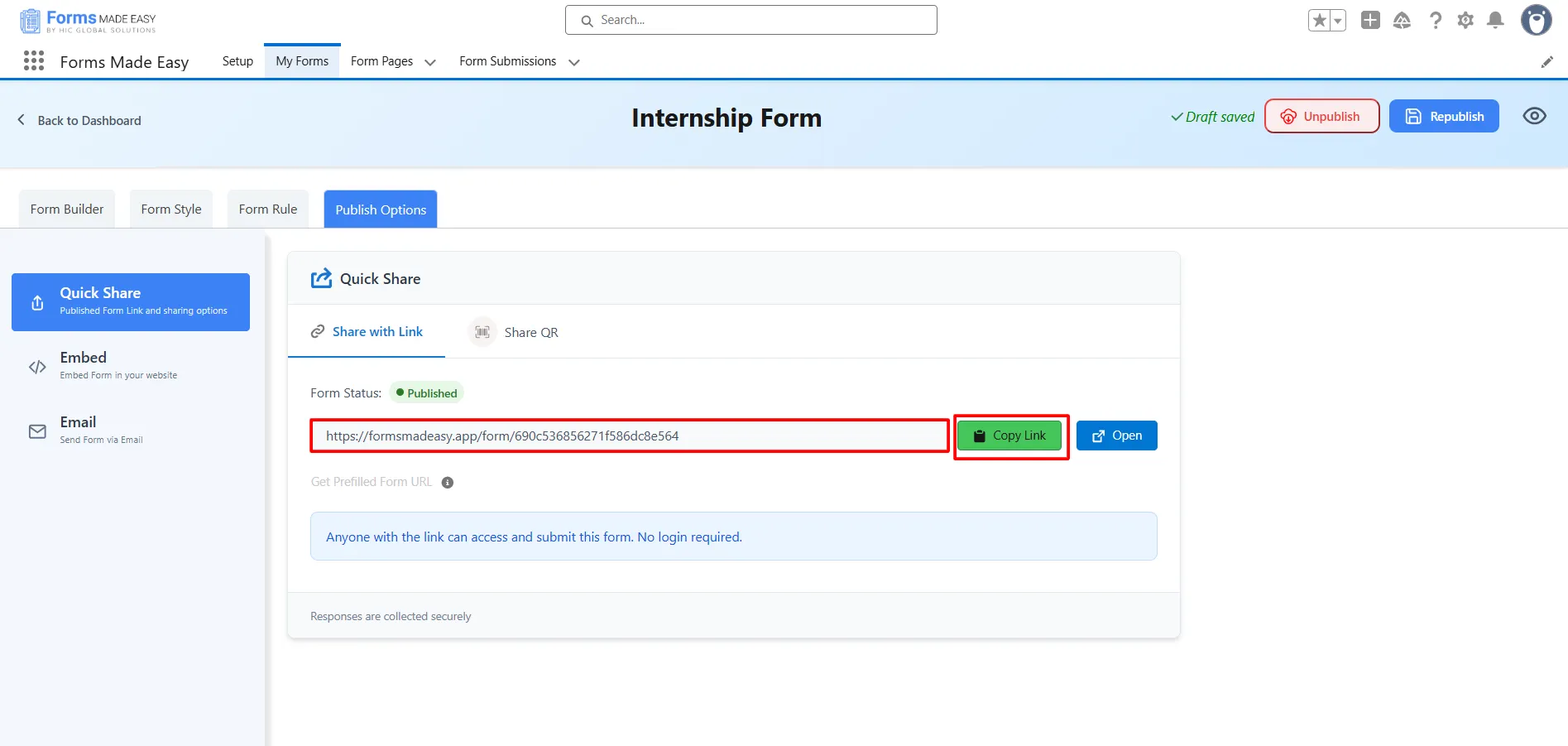 - Step 19: Click on the Copy Link button to copy the form URL, which you can then share with others. You can also manually copy the link.