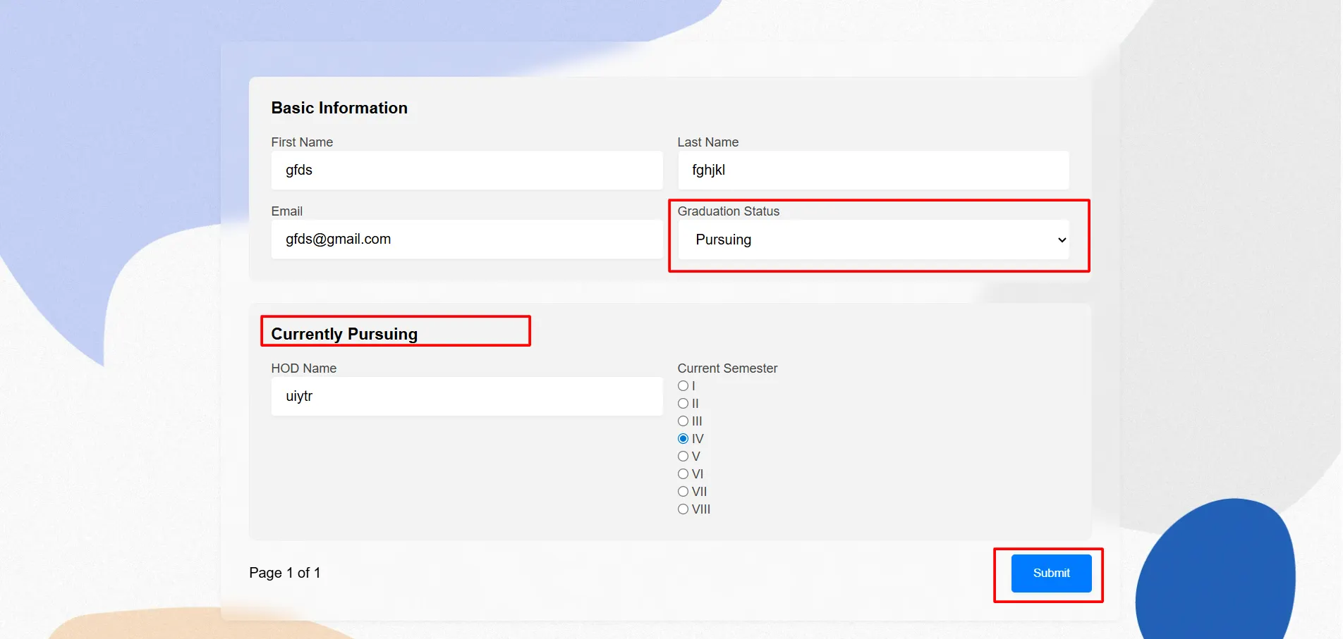 (Note: When you select Graduation Status as Completed, the Graduated section will be automatically populated. When you select Graduation Status as Pursuing, the Currently Pursuing section will be automatically populated. And when you select Graduation Status as Not Started, the Not Eligible section will be automatically populated.)