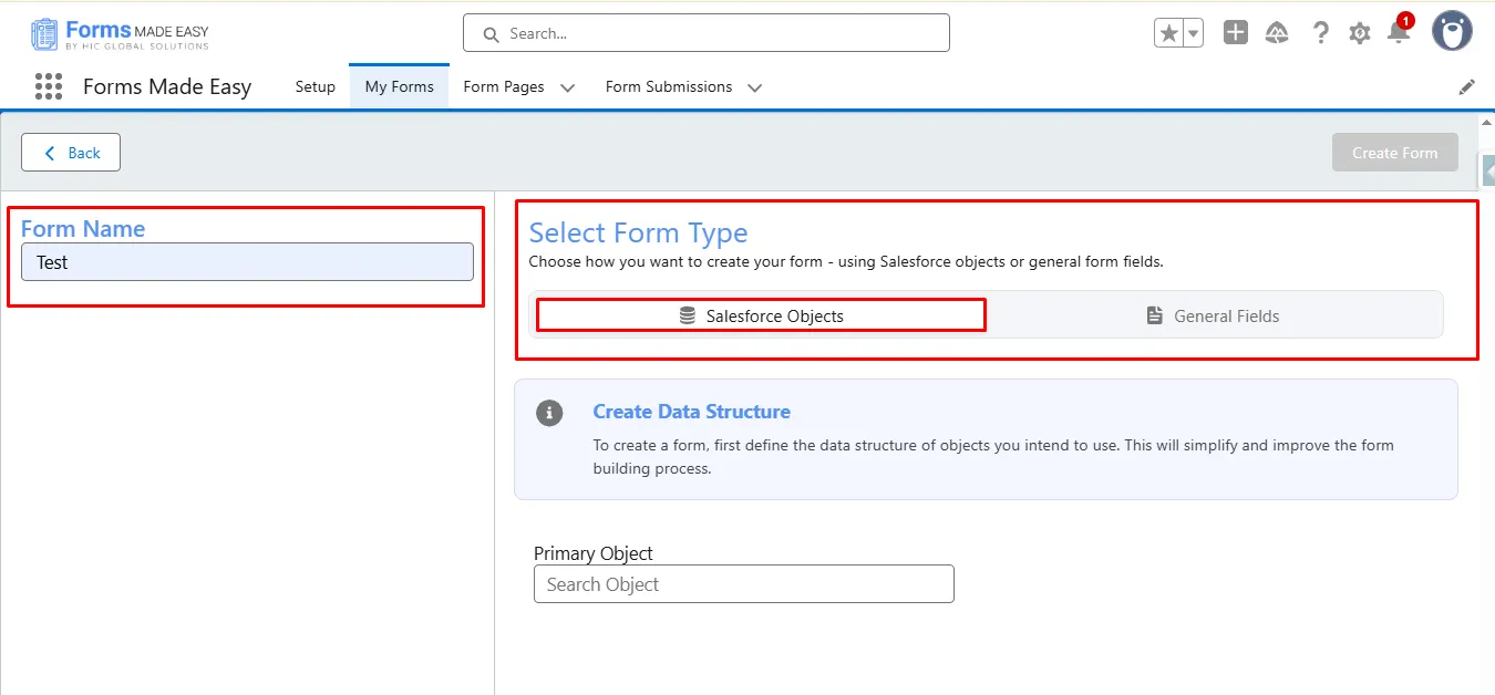 - Step 2: Enter the form name and select the form type (Salesforce Objects or General Fields).