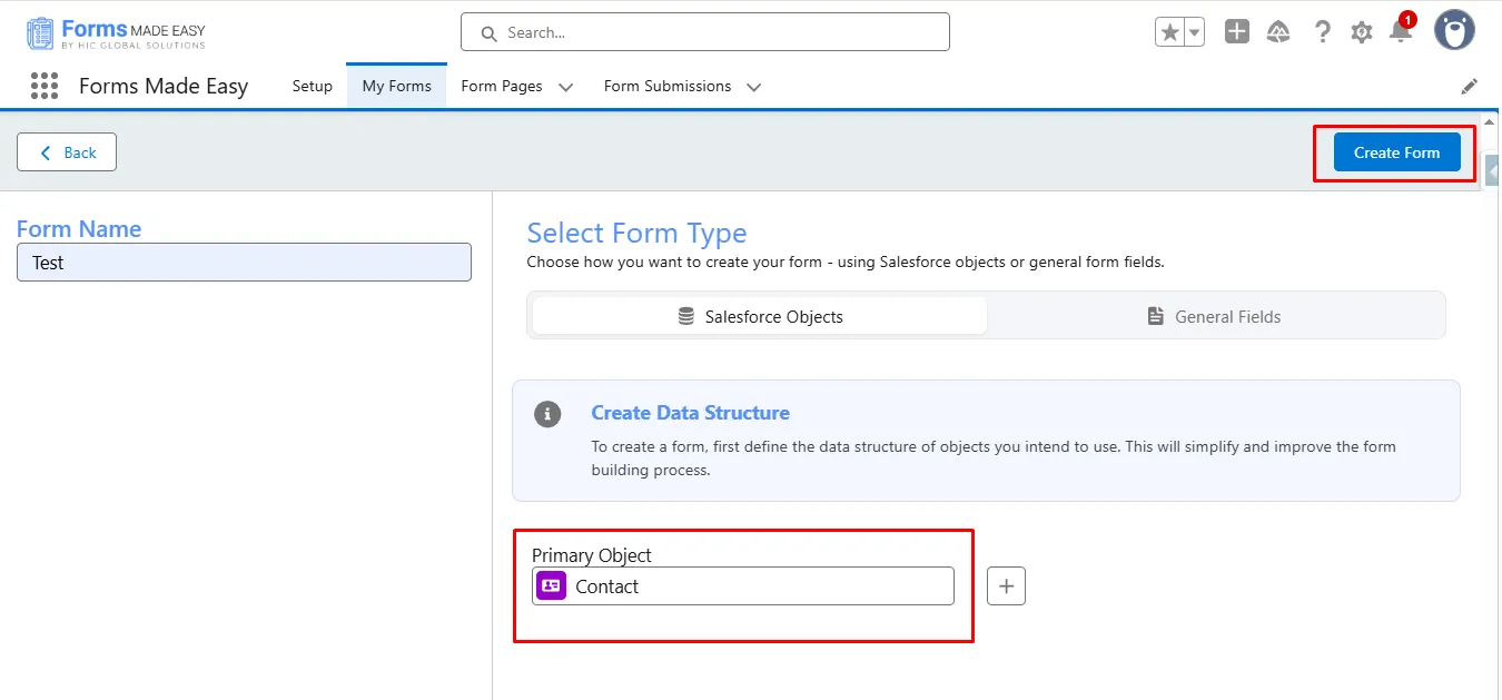- Step 3: Select "Contact" as the Primary Object and click the "Create Form" button.