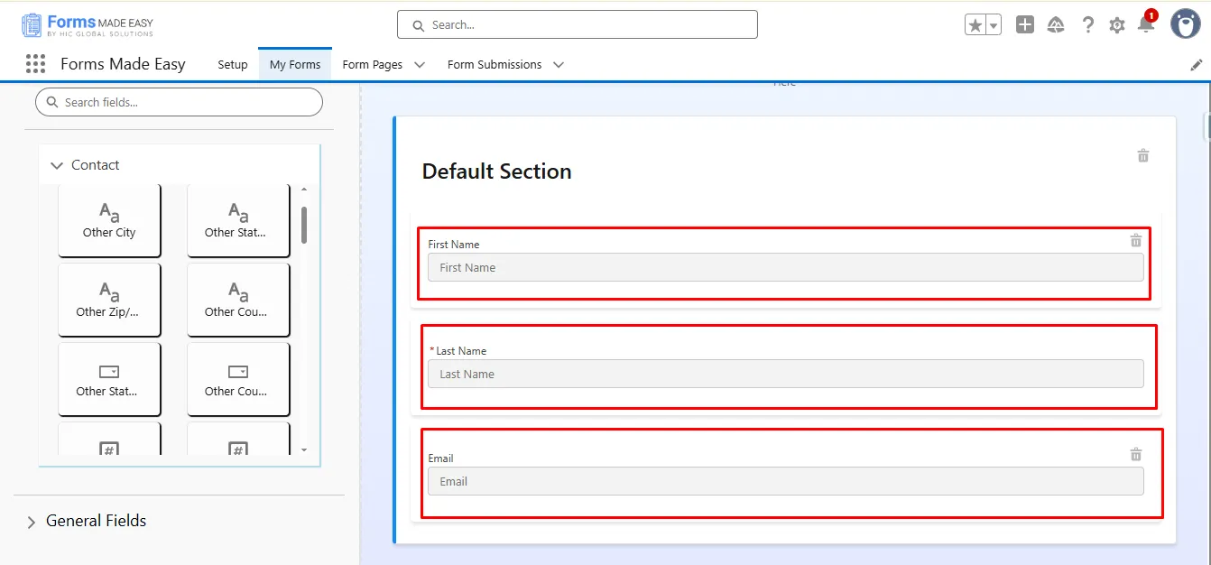 - Step 5: Drag and drop the First Name and Email fields from Contact.