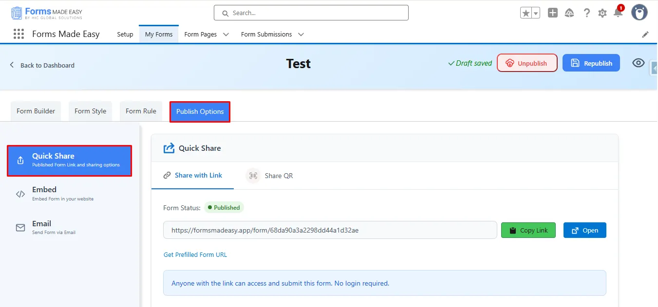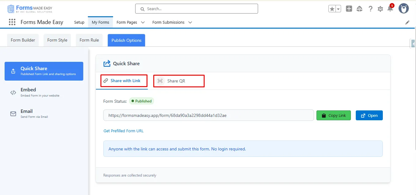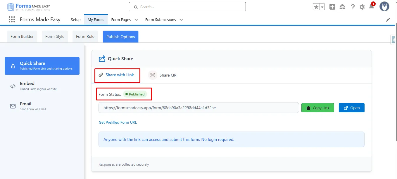 - Step 11: Within the Share with Link section, you will see the Form Status displayed as : Published.