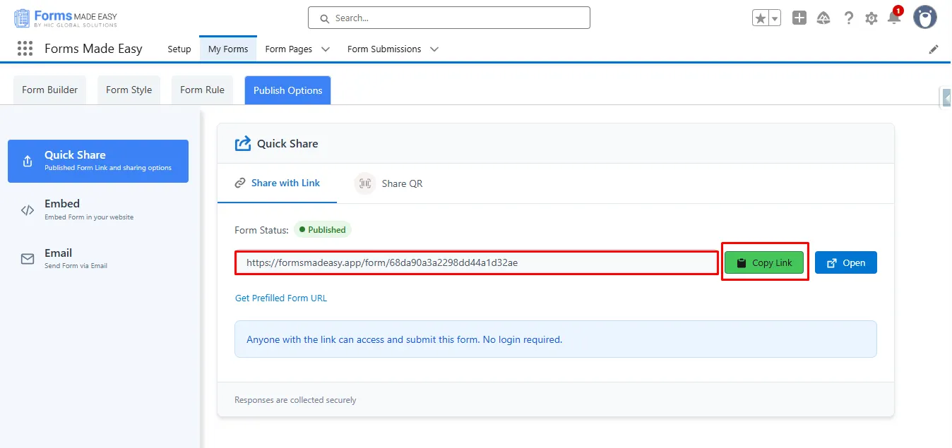 - Step 12: Click on the "Copy Link" button to copy the form URL, which you can then share with others. You can also manually copy the link.