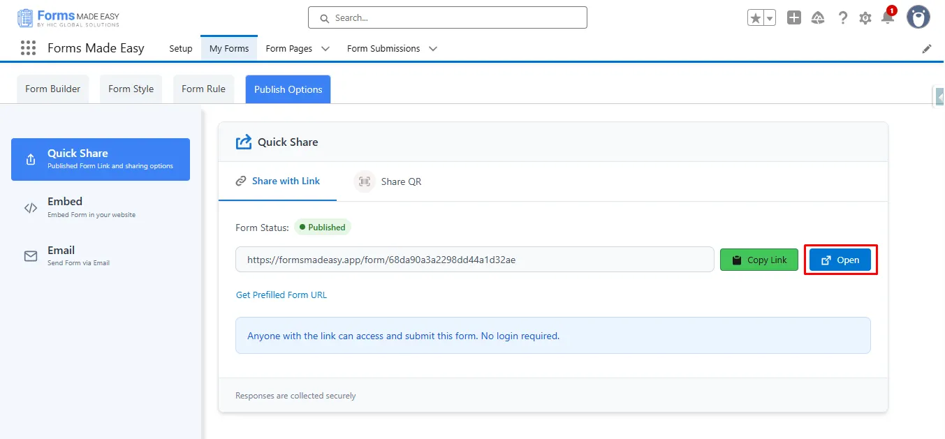 - Step 13: Click on the "Open" button to directly open the form in your web browser.