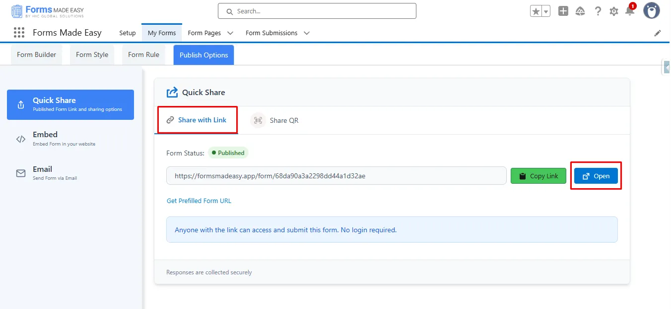 - Step 16: Now, Click on the "Share with Link" tab and click on the "Open" buttons to open the form in your web.
