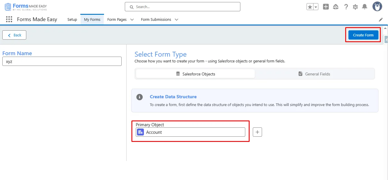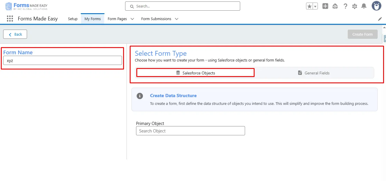 - Step 2: Enter the form name and select the form type (Salesforce Objects or General Fields).