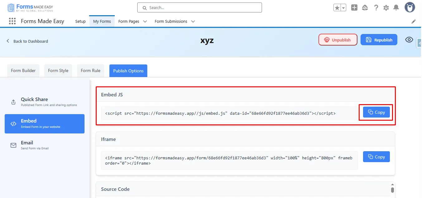 To begin, create a form with the required fields and publish it. Once the form is published, a Publish tab becomes available. Under the Publish tab, you'll find the Embed section, which provides three options: Embed JS, Iframe, and Source Code.