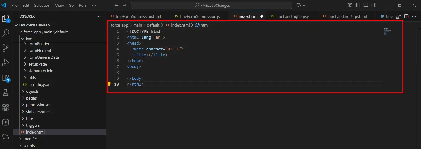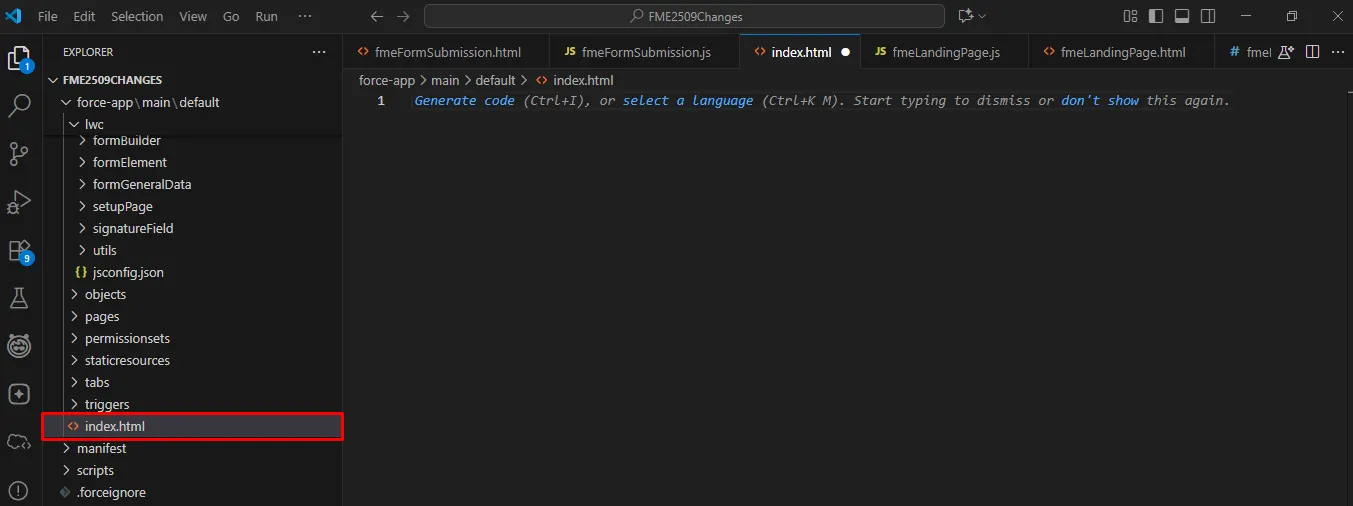 - Step 14: Inside the newly created .html file, type “!” and press Tab (or Enter) to generate a basic HTML boilerplate template automatically.
