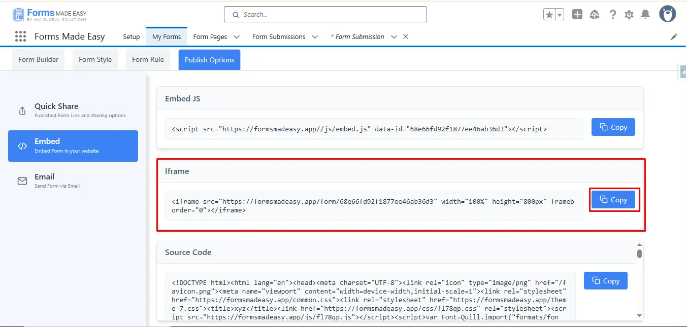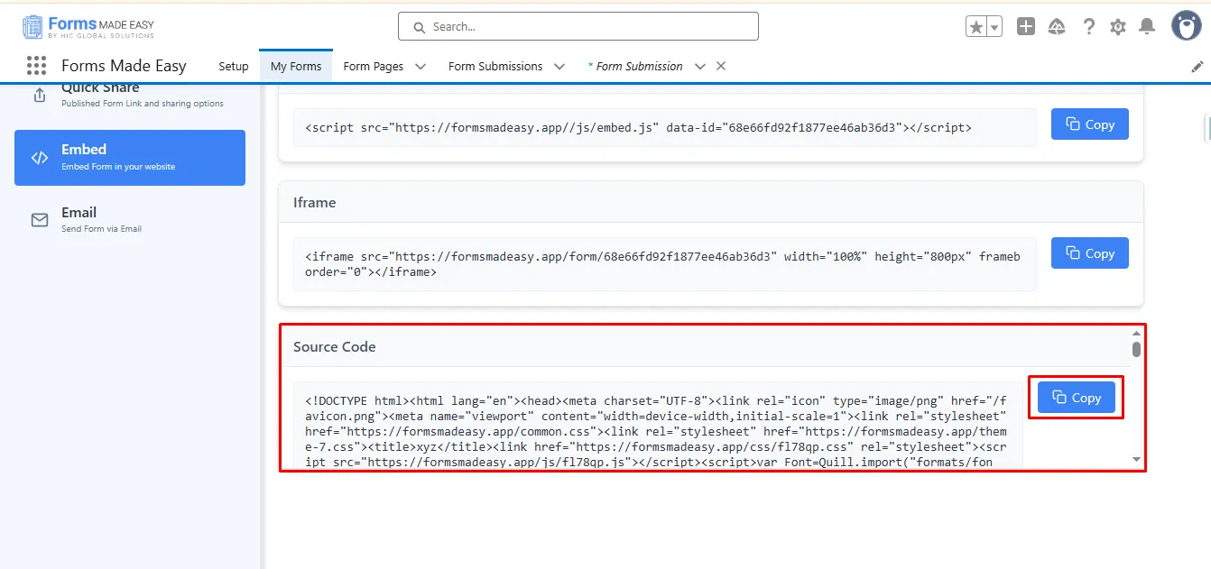 Source Code gives you full control to customize the form's HTML before embedding, offering maximum flexibility for advanced users who want to modify every aspect of the form.