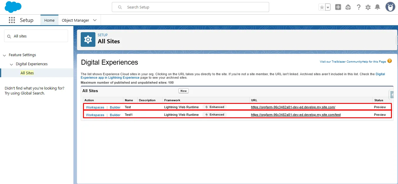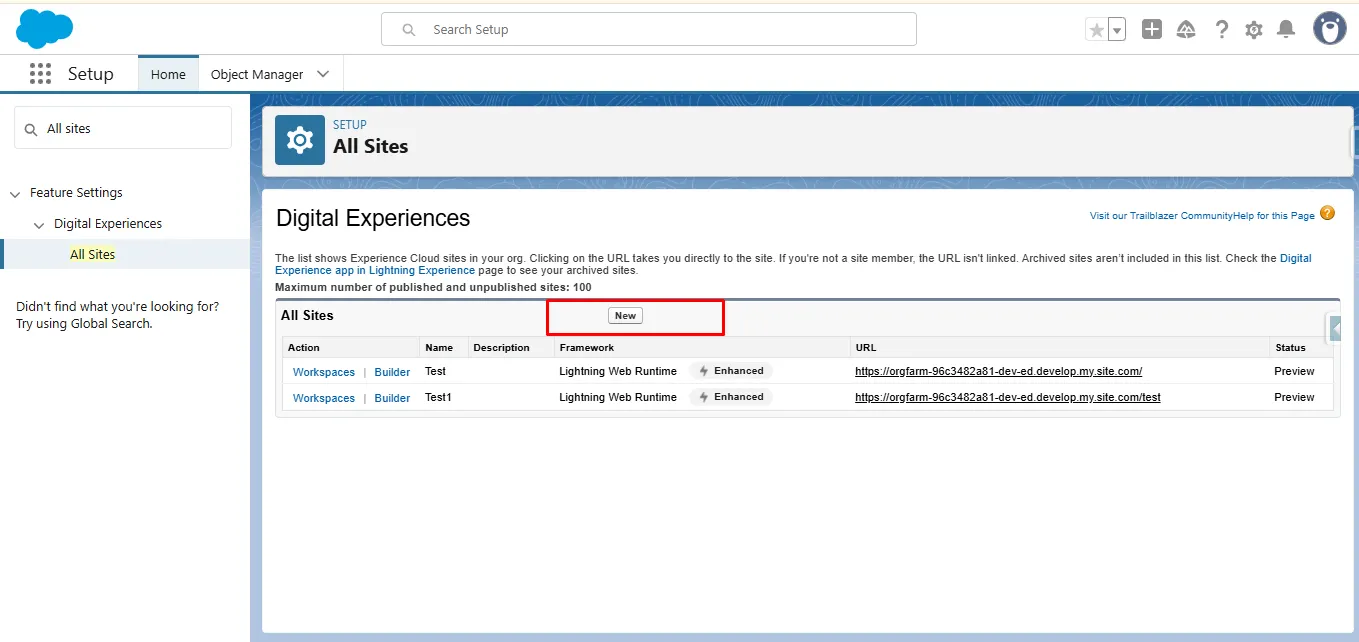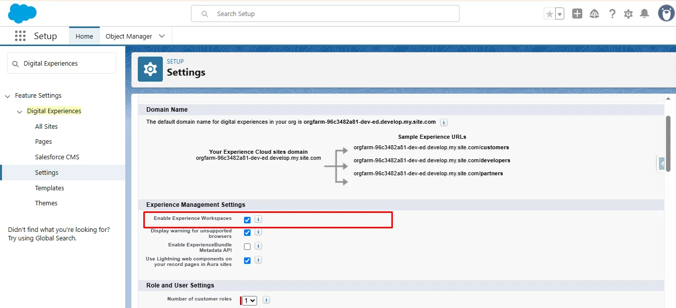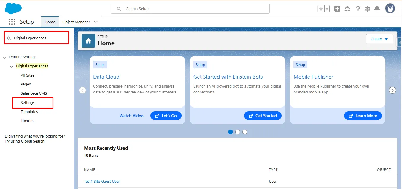 - Step 24: In the, Quick Find box, type “Digital Experiences” and select Settings.