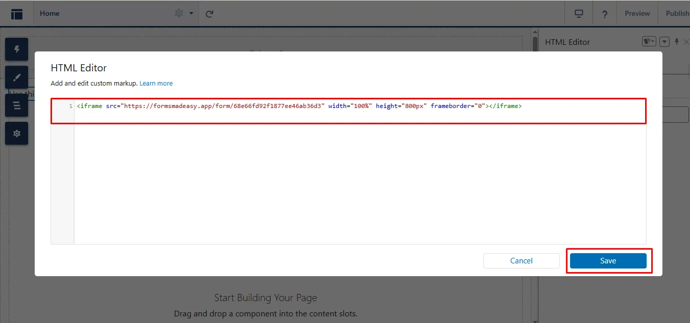- Step 36: Paste the copied Iframe code inside the HTML Editor, then click on Save button.