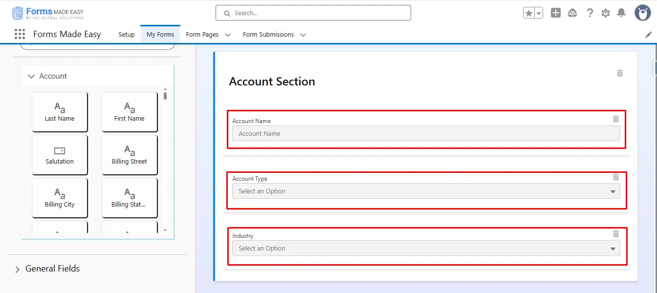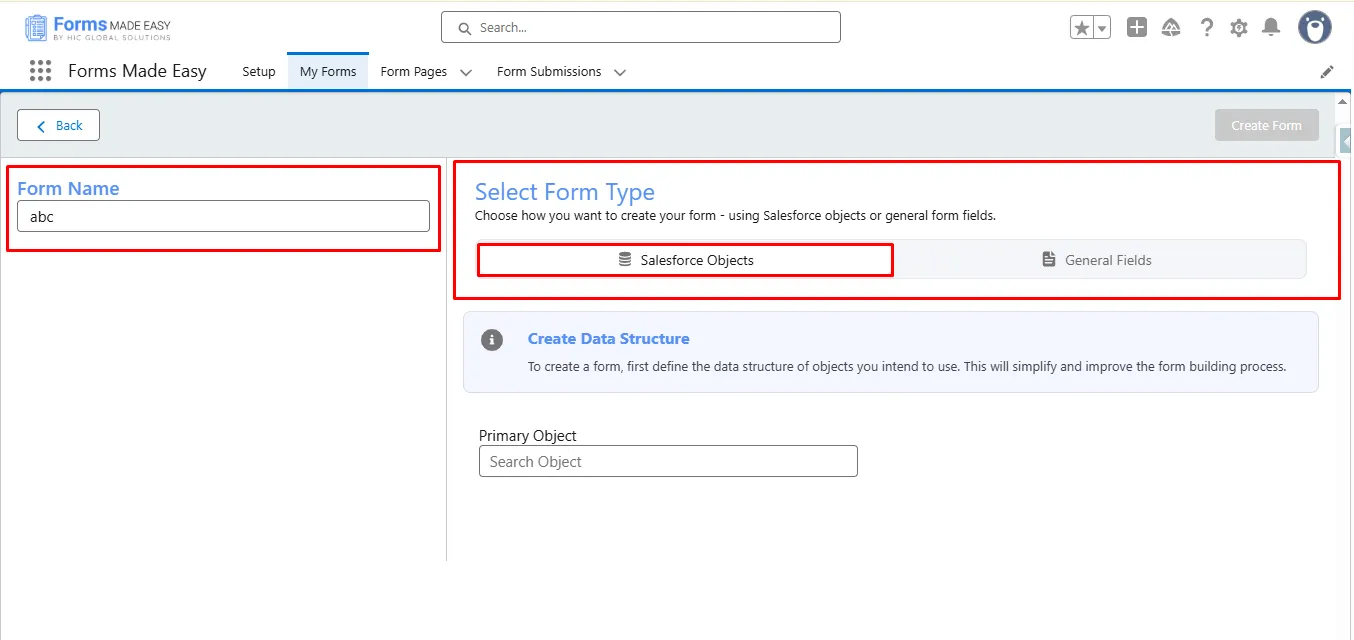 - Step 2: Enter the form name and select the form type (Salesforce Objects or General Fields).