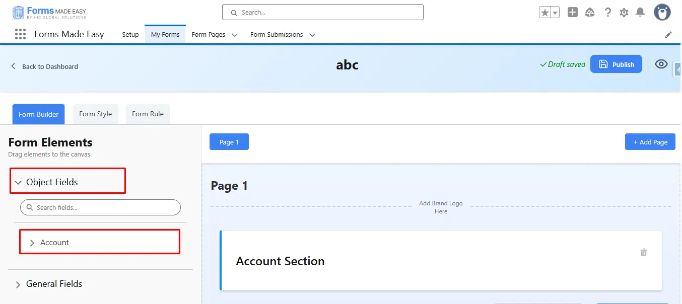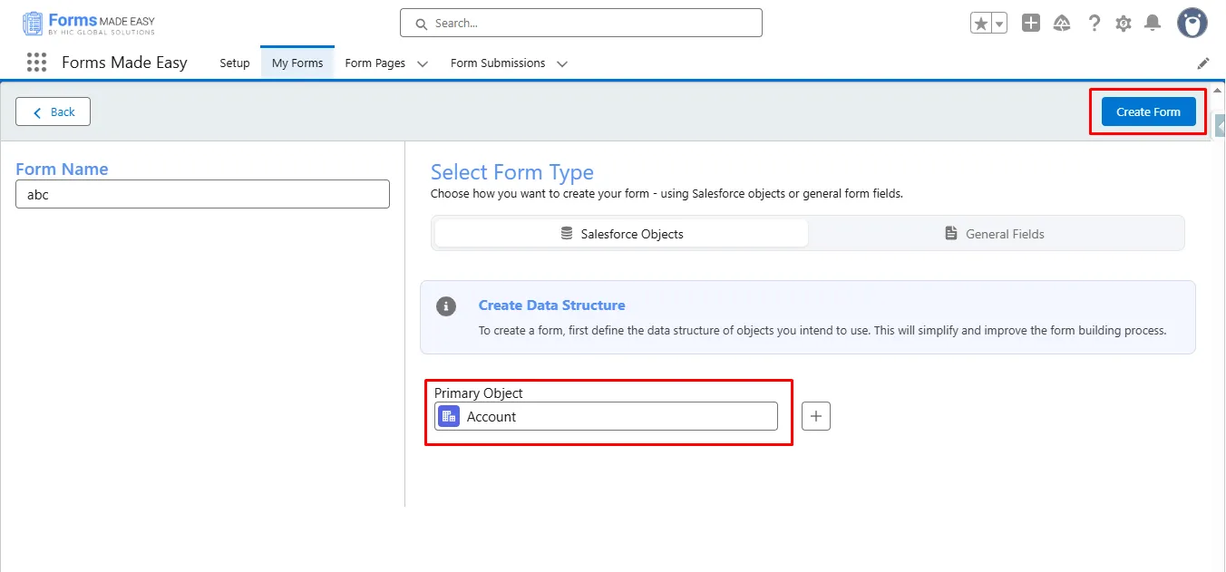 - Step 3: Select "Account" as the Primary Object and click the "Create Form" button.