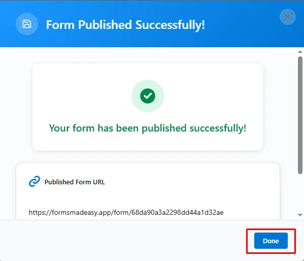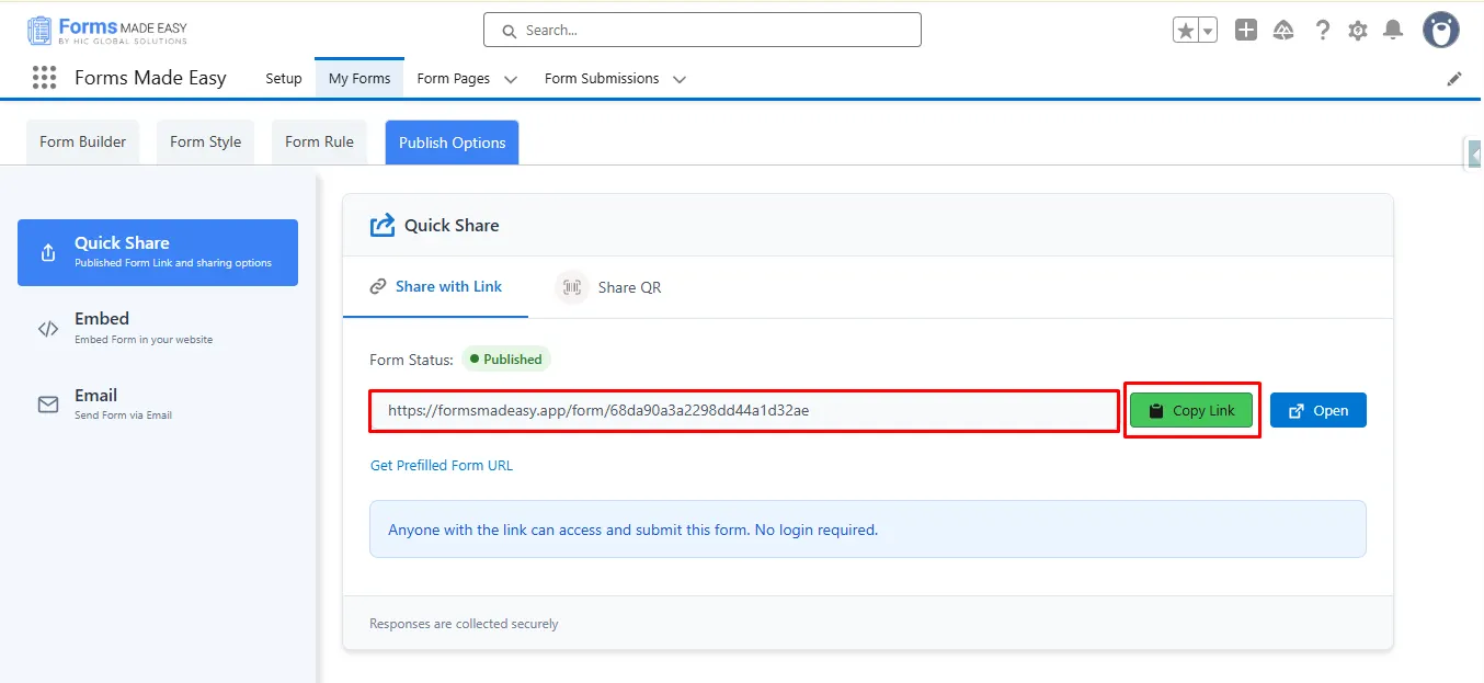 - Step 12: Click on the "Copy Link" button to copy the form URL, which you can then share with others. You can also manually copy the link.