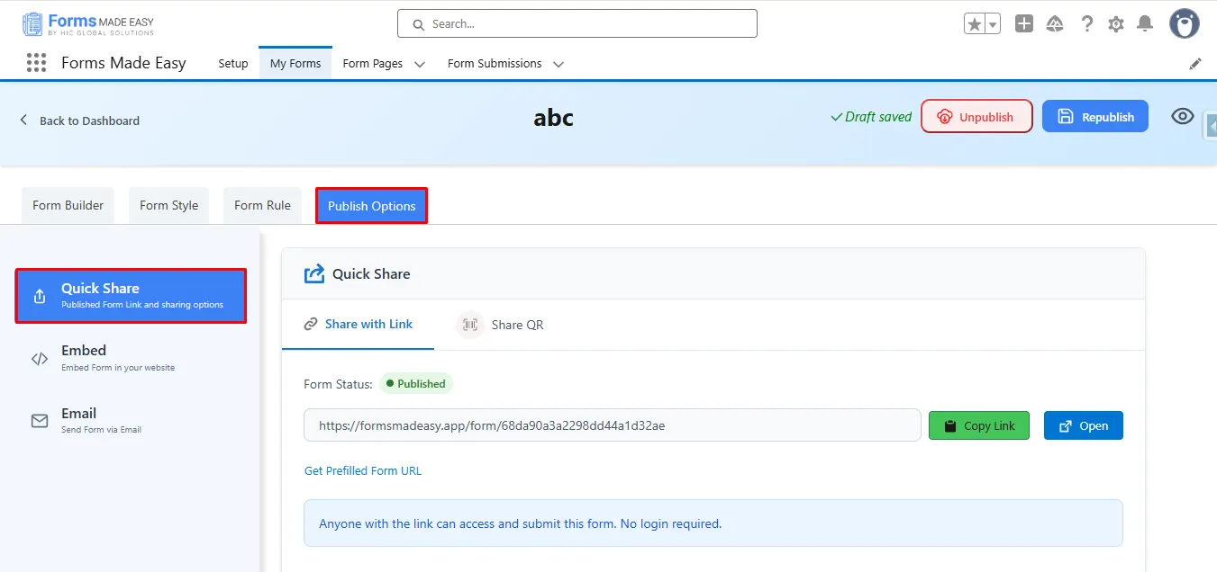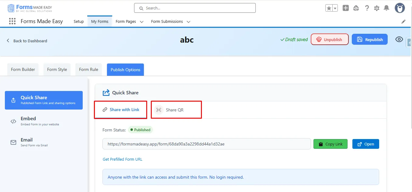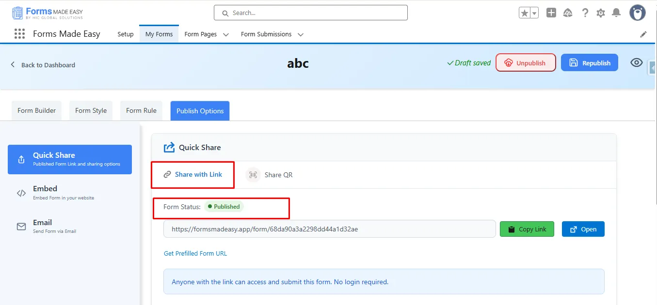 - Step 11: Within the Share with Link section, you will see the Form Status displayed as : Published.