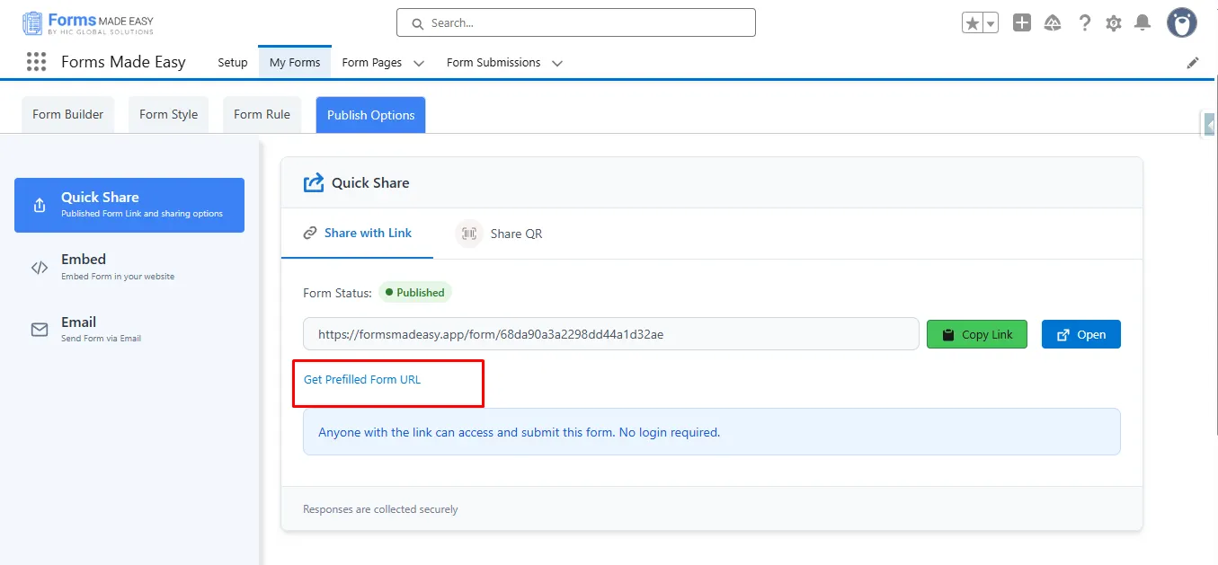 - Step 17: Click the Copy Link button to copy the Prefilled Form URL, and the Open button to open the Prefilled Form in a new browser tab.