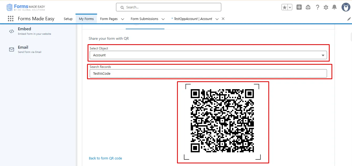 - Step 24: Now, Inside the Search Records section, you can search for records of the selected object by their name. Once a record is selected, a QR Code will be generated with prefilled data.